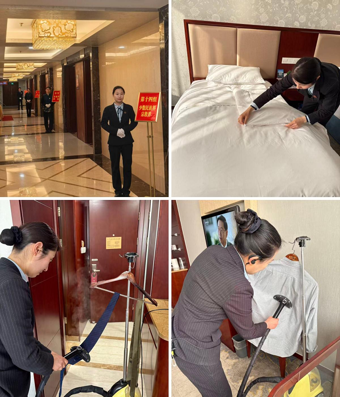 为保障大会的成功接待,临沂宾馆沂蒙路店组建专项接待小组,制定周密方案,细化责任分工。从会场布置、设备调试到客房清洁、用餐服务、车辆引导及应急保障,各部门紧密配合,服务各环节无缝对接,为委员们营造了舒适温馨的住宿、用餐、会议环境。接待期间宾馆推出一系列贴心举措:会务团队及时根据会议动态调整上下班时间,提升响应效率,做好会场准备;厨房团队精心定制融合传统鲁菜与健康膳食理念的“专属”菜单,收到委员们广泛好评;客房服务团队主动为委员们熨烫衣物,体现了服务的细致与贴心。