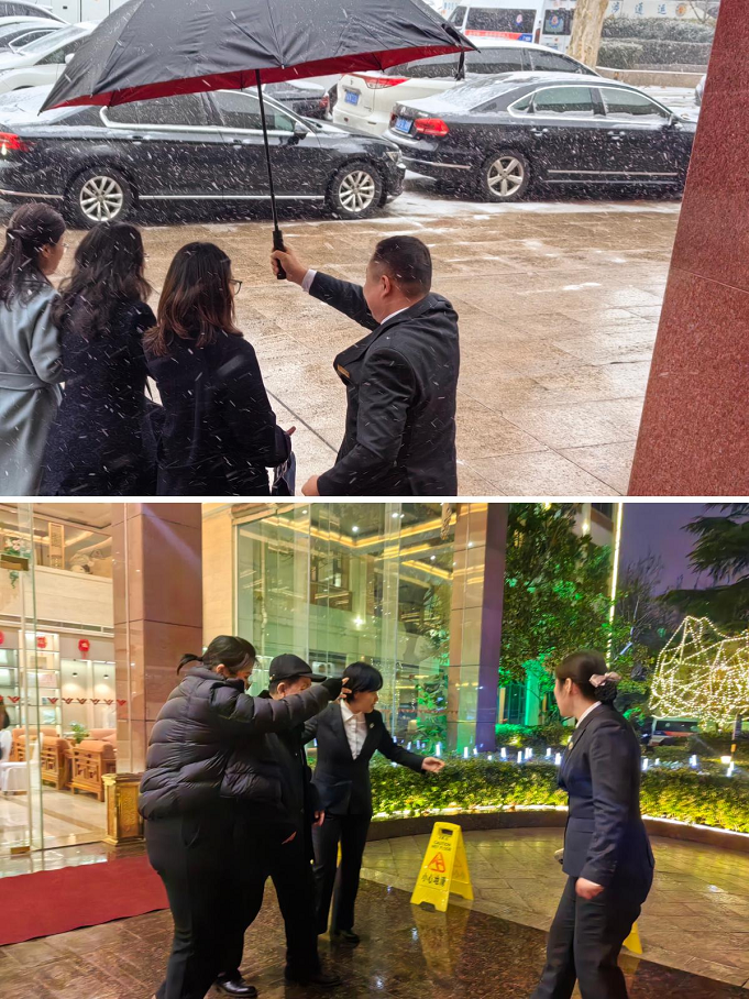 面对严寒冰雪天气,沂蒙路店积极应对,提前制定预案,使用推拉棚搭建防雪通道。夜间,安保部和房务部值班人员每隔一段时间便清理一次主干道和门前的积雪,防止结冰。清晨,全店干部员工早到店清理积雪,有效保障了道路畅通与委员们的出行安全。同时,根据天气变化做好各项细节服务,顺利应对极端天气带来的各类影响。